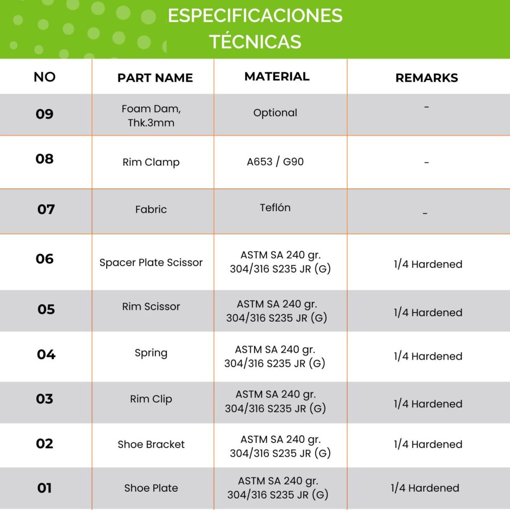 Storagetech™ recomienda el uso de sellado tipo tijera en el lugar del sello del pantógrafo para equilibrar la relación precio/rendimiento para productos de almacenamiento livianos o volátiles extremadamente corrosivos. El rendimiento eficaz del sellado puede cubrir aberturas de hasta 200 mm. y puede funcionar con una tolerancia de ±100 mm. Gracias a su sistema de resorte superior, cumple con éxito con un ancho de llanta de 300 mm y funciona de manera efectiva con una tolerancia máxima de ±100 mm en el rango.